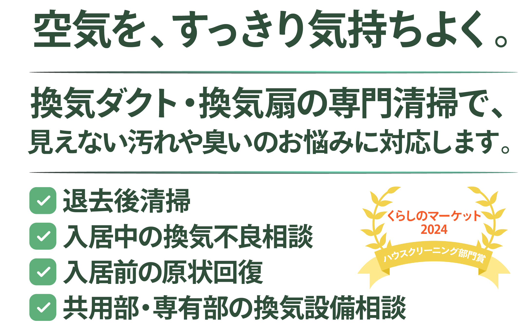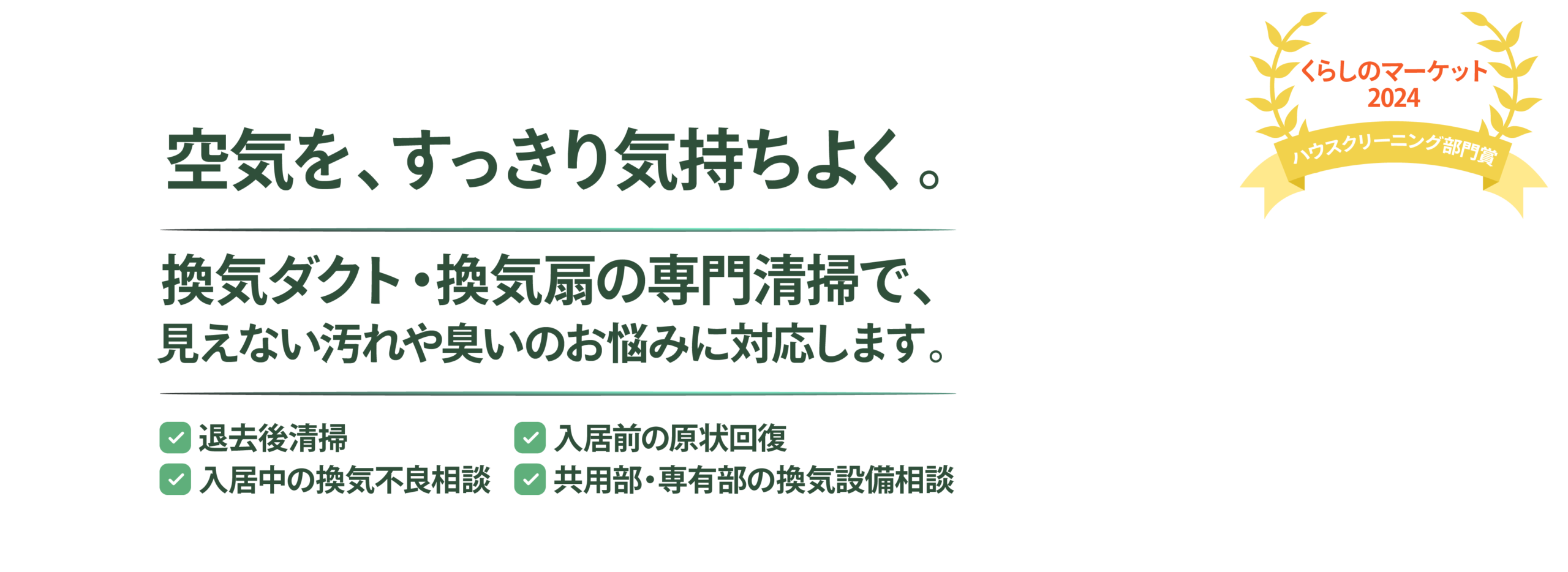 入居中のお部屋で気になる臭いや換気不良のご相談はもちろん、退去後や入居前の空室清掃についても対応可能です。